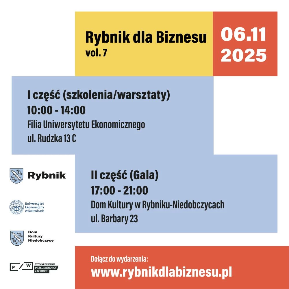 Udział w konferencji jest bezpłatny, lecz wymaga wcześniejszej rejestracji. Formularz zgłoszeniowy dostępny jest pod adresem: app.evenea.pl/event/rybnikdlabiznesuvol7.