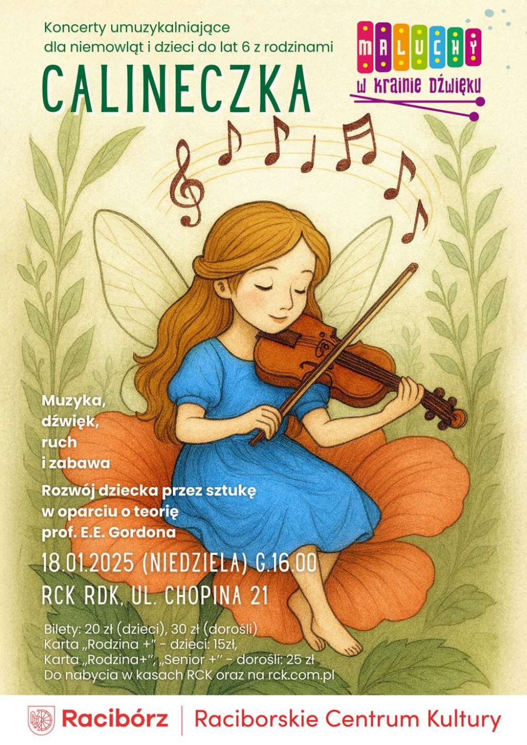 Raciborskie Centrum Kultury zaprasza najmłodszych melomanów wraz z rodzinami na kolejną odsłonę popularnego cyklu edukacyjnego pod tytułem „Maluchy w krainie dźwięku”, która odbędzie się w niedzielę 18 stycznia o godz. 16:00. Najbliższe spotkanie pod hasłem „Calineczka” zostanie zorganizowane w sali kameralnej RDK przy ul. Chopina 21, a ze względu na trwający karnawał organizatorzy zachęcają uczestników do przybycia w kolorowych przebraniach Bilety na to wydarzenie są dostępne w kasie RCK RDK i na biletyna.pl/event/view/id/611409. Zniżki dla posiadaczy raciborskich kart „Senior 60+” oraz „Rodzina +”.