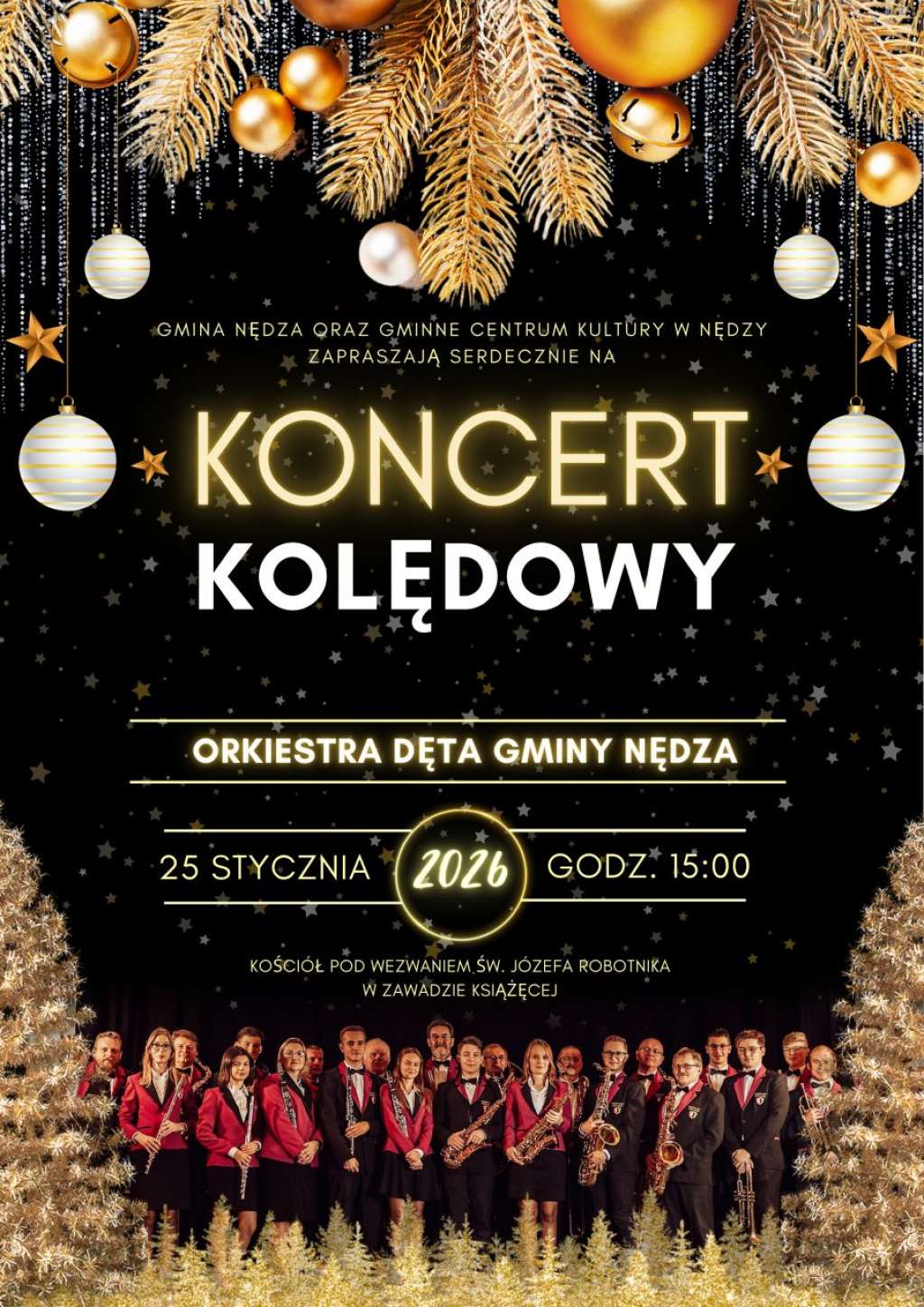 Gminne Centrum Kultury w Nędzy i Gmina Nędza zapraszają mieszkańców i gości na koncert kolędowy, który odbędzie się w najbliższą niedzielę, 25 stycznia o godz 15:00. W kościele pw. św. Józefa Robotnika w Zawadzie Książęcej wybrzmią najpiękniejsze polskie kolędy i pastorałki w wykonaniu Orkiestry Dętej Gminy Nędza. Wydarzenie to to okazja, by przedłużyć bożonarodzeniową radość i spędzić czas w podniosłej, a zarazem ciepłej atmosferze. Program koncertu opierać się będzie na autorskich aranżacjach znanych utworów, a kunszt orkiestry dętej zostanie uzupełniony o warstwę wokalną – muzykom towarzyszyć będą soliści: Magdalena i Kamil Klimkowie. Wstęp na koncert jest bezpłatny.